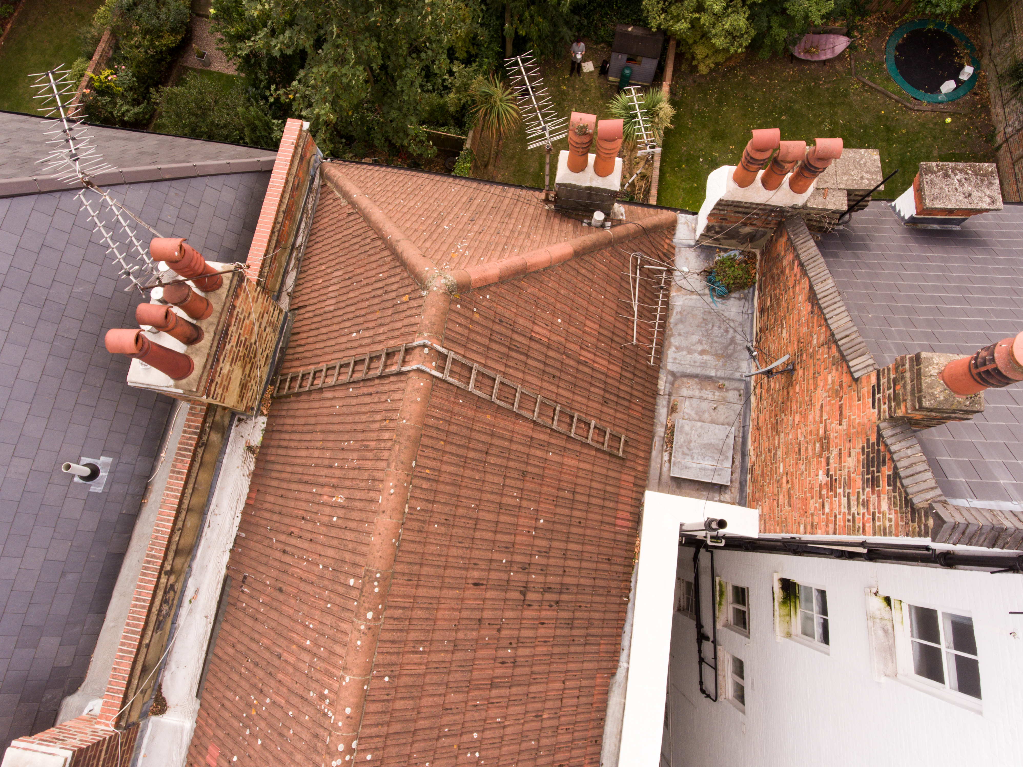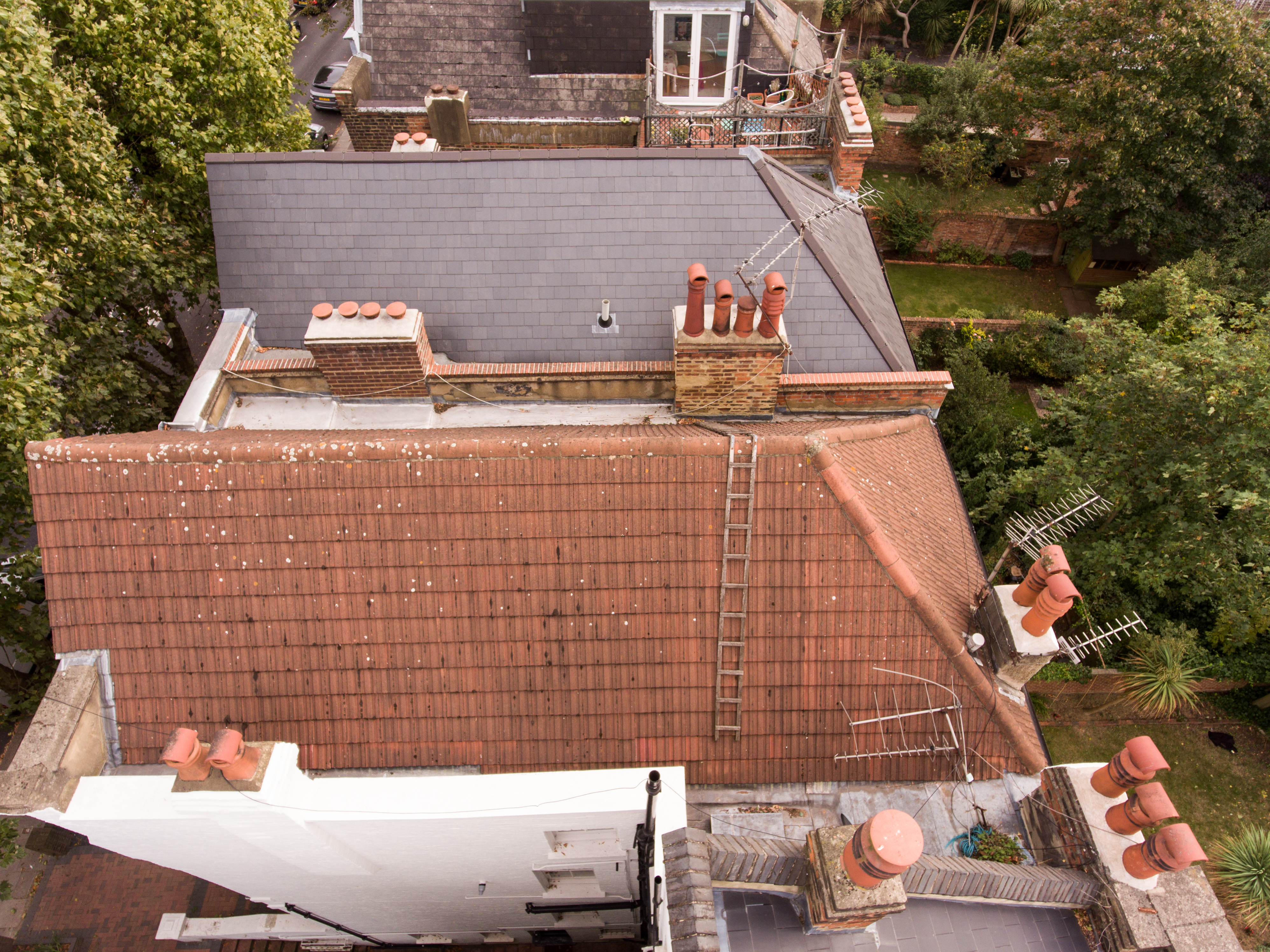 SkyCam was recently asked to survey the roof of this 3-storey property to try and discover where the water staining (seen on the LHS white faced wall) was coming from. This required a drone roof inspection.